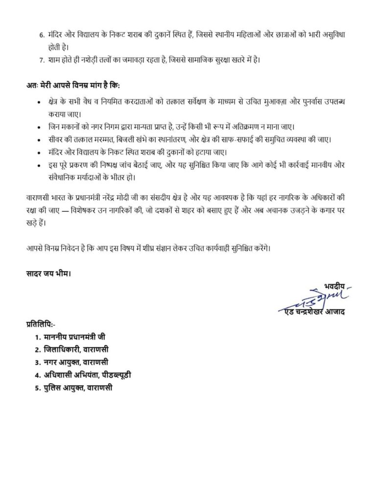 चंद्रशेखर ने कहा कि वह विकास के विरोधी नहीं हैं, लेकिन विकास के नाम पर गरीबों और पिछड़े वर्गों को उजाड़ देना, बिना मुआवजा या पुनर्वास के उनकी ज़िंदगियों को तबाह करना स्वीकार्य नहीं है। उन्होंने प्रशासन से अपील की कि सड़क चौड़ीकरण और अन्य योजनाएं जनकल्याण और संवेदनशीलता के साथ लागू की जाएं।
