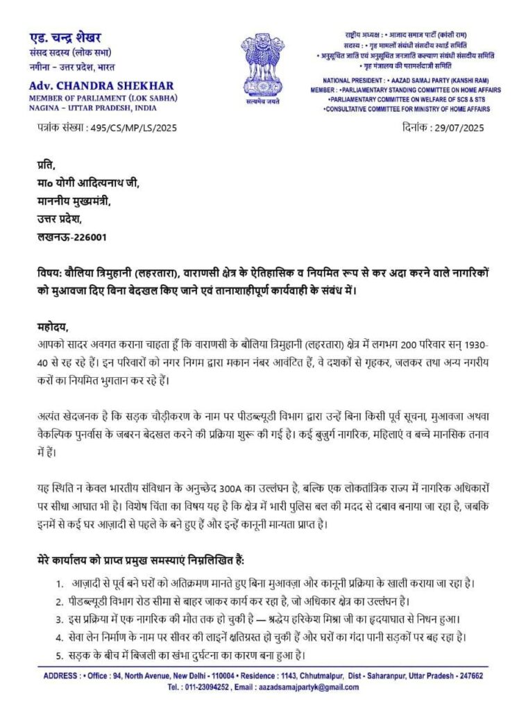 वाराणसी, 30 जुलाई 2025। वाराणसी के लहरतारा-बौलिया क्षेत्र में इन दिनों सड़क चौड़ीकरण के नाम पर पीडब्ल्यूडी द्वारा की जा रही बुलडोजर कार्रवाई को लेकर विवाद गहराता जा रहा है। इसी क्रम में नगीना से लोकसभा सांसद और आजाद समाज पार्टी (कांशीराम) के राष्ट्रीय अध्यक्ष चंद्रशेखर आज़ाद ने उत्तर प्रदेश के मुख्यमंत्री योगी आदित्यनाथ को पत्र लिखकर इस कार्रवाई पर गंभीर आपत्ति जताई है।