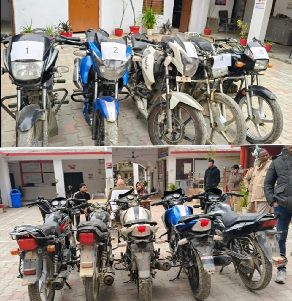 वाराणसी। अंतरजनपदीय वाहन चोरी गिरोह के खिलाफ चलाए जा रहे अभियान के तहत वाराणसी कैंट पुलिस को बड़ी सफलता हाथ लगी है। चेकिंग अभियान के दौरान पुलिस ने दो शातिर वाहन चोरों को गिरफ्तार कर उनके कब्जे से चोरी की पांच मोटरसाइकिलें बरामद की हैं। बरामद वाहनों में स्प्लेंडर प्लस, अपाचे आरटीआर समेत अन्य मोटरसाइकिलें शामिल हैं, जो थाना कैंट क्षेत्र में पूर्व में दर्ज विभिन्न मुकदमों से संबंधित बताई जा रही हैं।